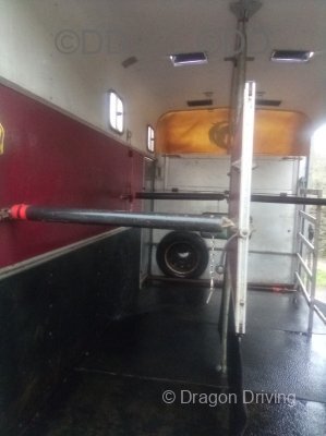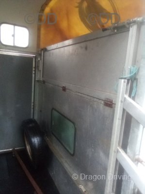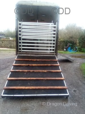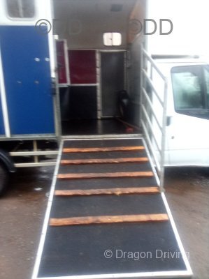 Has rear loading ramp and side loading ramp, has partitions. Can make as one box or make it as 2-3 horse to be taken. Overhead storage.