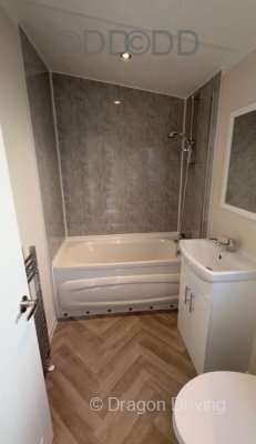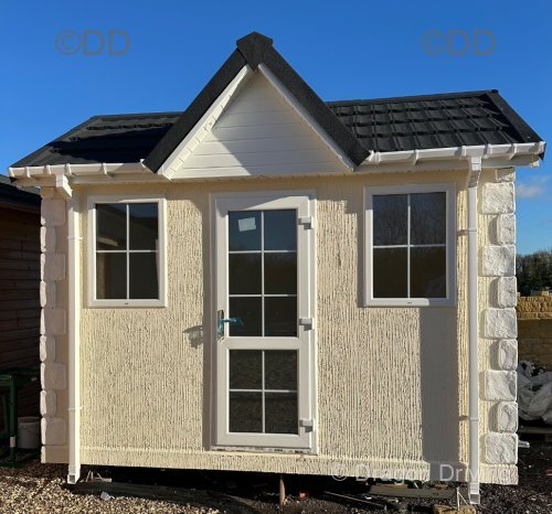 chalet day room, brand new ready to go. 12ft 6 by 7ft, chrome switches and sockets, down lights in soffits, white Georgian bar windows and door.