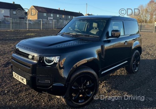 2025 reg 90 Land Rover Defender D250, auto, diesel. Full sliding glass roof, digital clocks, wireless phone charger, detachable tow bar, black with a black pack with upgraded black wheels.