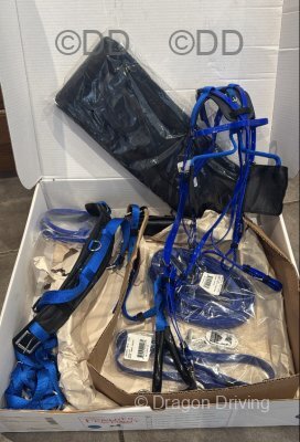 Comes with extras bell boots, bandages. All in matching royal blue. Pony standard.