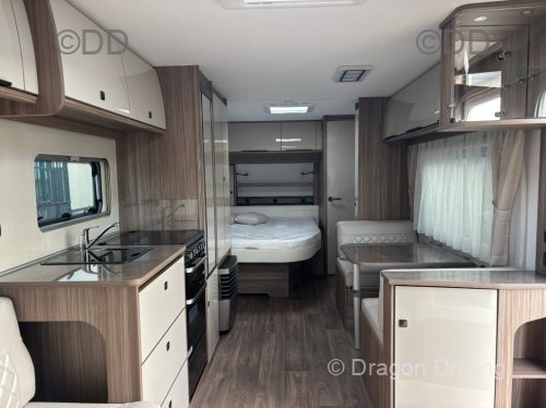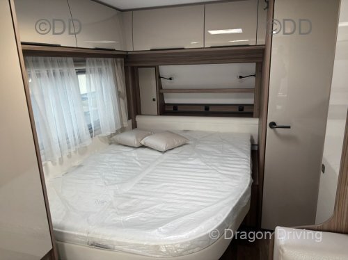 LMC 595 EXQUISITE VIP 2024. In excellent condition, with many upgrades, both inside and out. With fixed island bed, large leather horseshoe seating and separate shower and toilet.