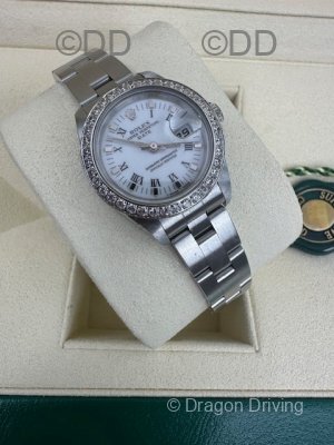 Rolex Ladies Date, 26mm steel model, box and papers, Rolex white Roman dial, stone set bezel, Oyster bracelet. 1999, immaculate.