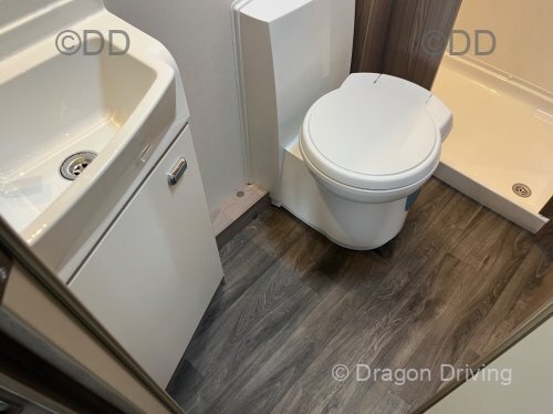 Central dining area. Central kitchen includes a large refrigerator, freezer, grill and dual fuel hobs. Central washroom features a toilet, shower and vanity sink.