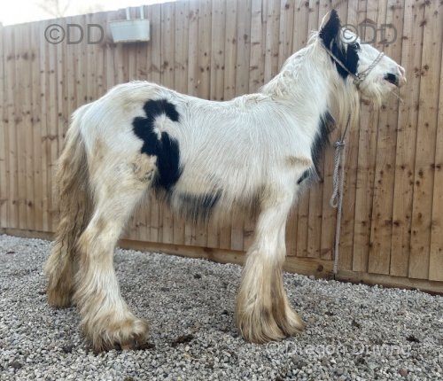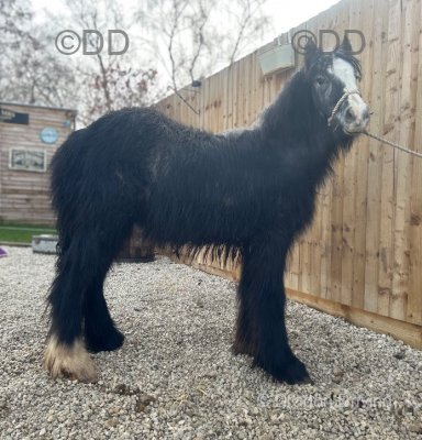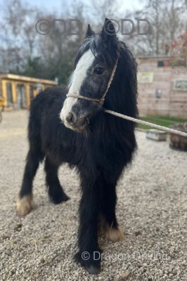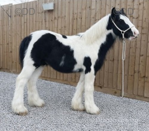 Black and white traditional cob colt, to make 13.2hh. Easy to box, do his feet and catch, halter broken and will tie up safely.