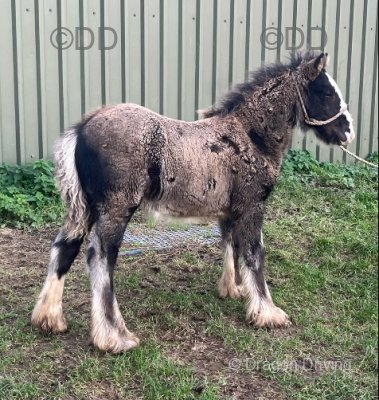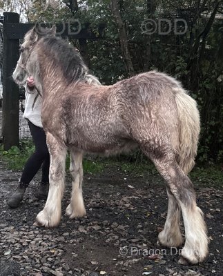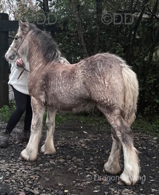 For sale, a very heavy silver dapple filly foal, what a cracker of a filly she is too. Pure silky hair, very, very heavy, 6 months old filly.