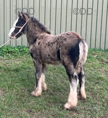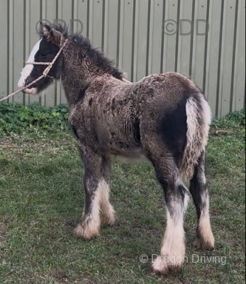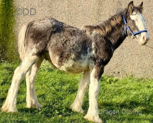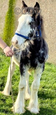 6 months old, Friesian x traditional cob piebald filly. Very classy with lovely movement.
