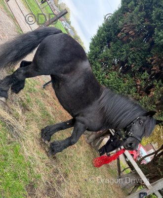 She can live in or out, although at present she is in in the day, winter in at night. Up to date with vaccination, worming, teeth & health check. Passport. Open to vettings. She comes with wardrobe; rugs, saddle bridle. Lots of videos/ photos. £5,350. She can come as a complete outfit: Rene Shoop 4 wheel competition carriage; delayed steering, front & back brakes which have recently been serviced, comes with a dickie seat, Zilco harness with empathy collar & girth - in very good condition, like new. £7,250.