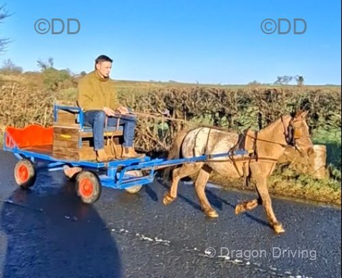 I feel she would suit any sphere, although she has shown in a show wagon, I feel she would excel in the private driving/exercise classes & definitely scurry/fei driving. She has a soft responsive mouth, turns on a sixpence. Not miserable & would go in a pair. Driven in open fields, surface & in heavy traffic amongst others. No vices.