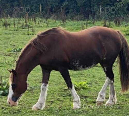Dotty 15.2hh 7 year old stepping cob mare, ride & drive. Can pull 2 & 4 wheel cart and currently being driven on a private track around farm animals and has previously been driven out on the roads. Vice when driving is a not 100% with windy conditions and things that flap about. Green under saddle was previously ridden in old home. Only been ridden with us a hand full of times over the years due to her being used for driving.