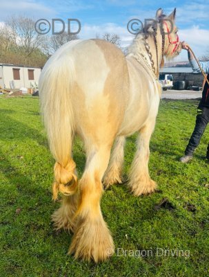 Has been driven previously but not with us, however he is very confident on long lines and knows his job. Casper is more woah than go and 100% bombproof in traffic, farmyard machinery, work tools, etc... Currently at a working farm and not phased by anything. Casper is good to do in all ways. perfect for farrier, to travel, to clip, for vet and dentists.