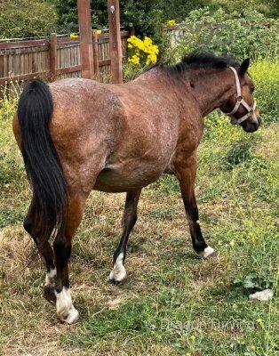 Little tiny 2 year old colt with a spotty bum, very powerful legs on him. Very well bred, King breeding. 10.2hh on the stick.