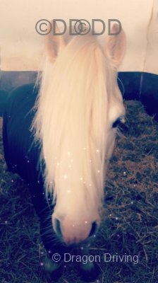 Dior, 14.1hh cremello mare coming 5 this time. Registered part bred. Very sweet mare. Broke to ride & drive, single or pair. Unbelievable to drive, single or pair very good in traffic. Stands about. Lovely head carriage and movement. Works well on a pair, done lots of pleasure driving with her.