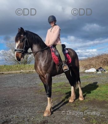 Daisy - 13.2hh, 9 year old, sold as a ride and drive to us but we haven't driven her. Great to ride, but can be stubborn sometimes when asked to stand.