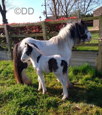 Big strong block of a cob mare with a traditional black and white colt foal at foot. Mare standing 12.3hh, previously broken to ride and drive, but obviously has had time off due to pregnancy.