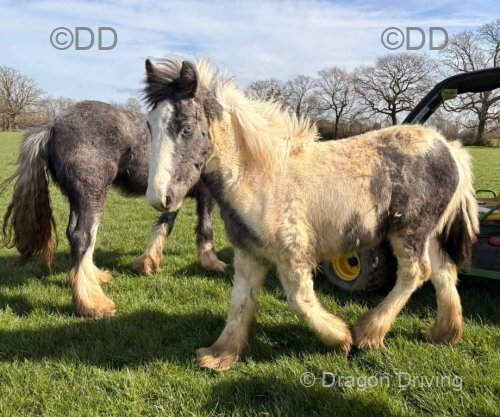 Two black and white fillies to make 12.1hh to 12.2hh, 12 months old. In their working clothes. Been wormed and feet trimmed. Blank canvases had halters on a couple of times.