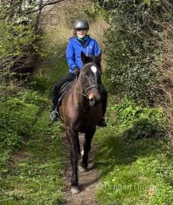 Ridden in an English saddle and bridle, she goes well in a snaffle. She has a lovely trot with nice movement. She is great in traffic and sensible at junctions. She is easy to load, good for the farrier, and to shoe. She stables well with good manners and turns out alone or with others. She is easy to bath and handle, and ties up perfectly.