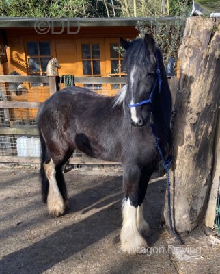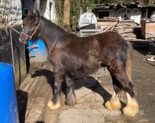 Friesian x cob filly, 13.3hh at the moment, expected to make 14.2hh plus.