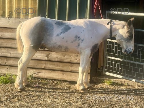 Spotted mare 15.3/16hh 5 years old. Just broken and ridden away down lane. Good to handle now just needs to continue work. Very flashy looking, moves well, stabled at moment with no stable vices.