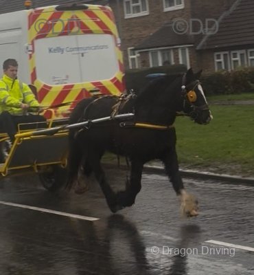 Giovarney. A rising 5 year old 13.3hh mare, recently been broken drive by myself. We're on week 3 and its her 4th time in the cart, 3rd time on the road.